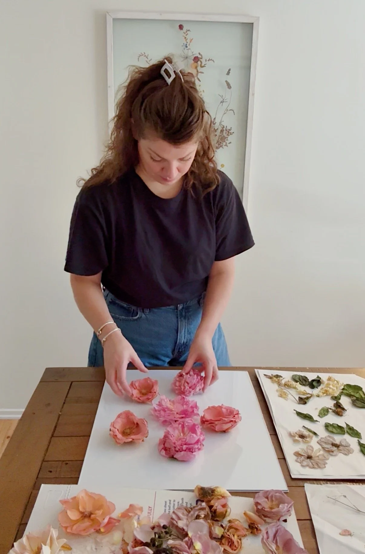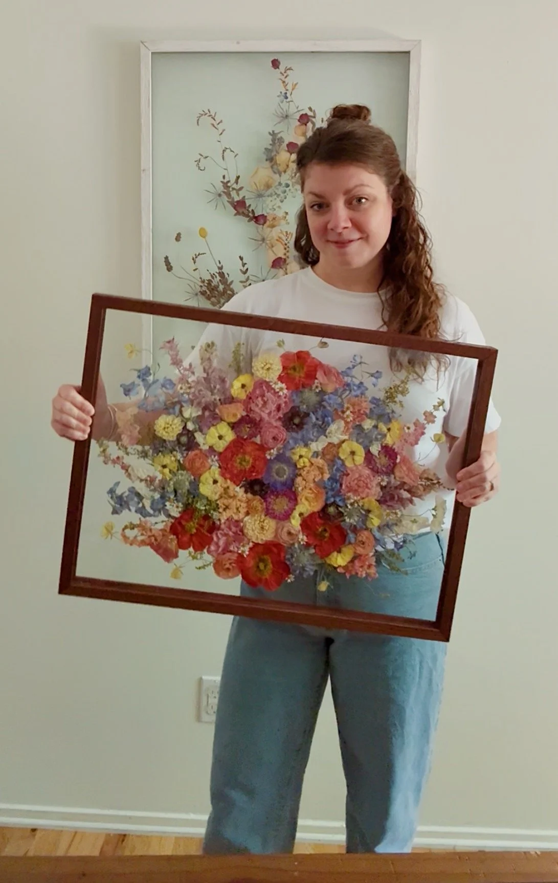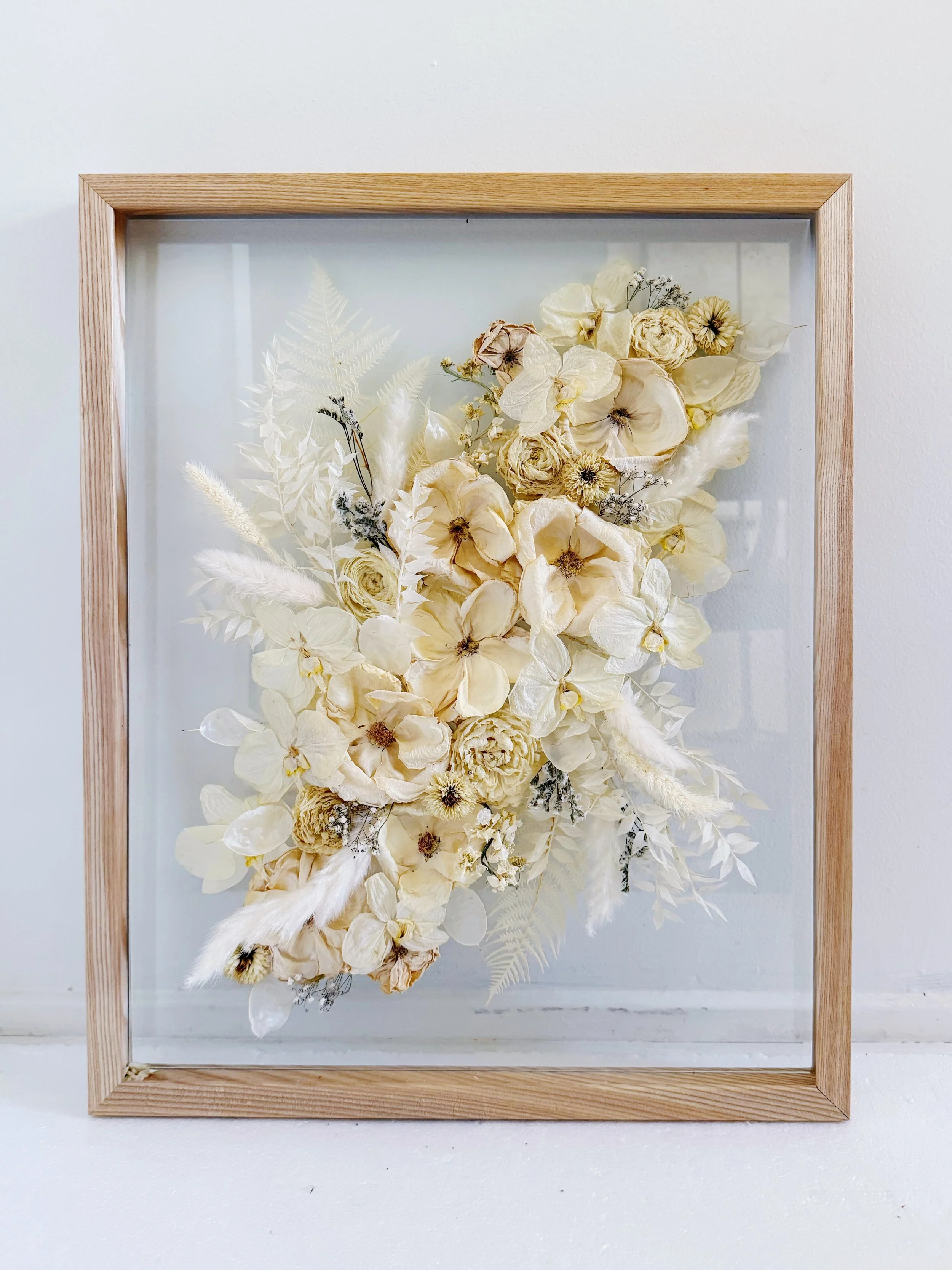 4. Once your flowers are completely dry, I will arrange them in the frame! Each bouquet is unique, so you will have a completely original piece of art to hang in your home! 16x20 and 18x24 inch customers will always receive photos of the layout prior to framing for approval.